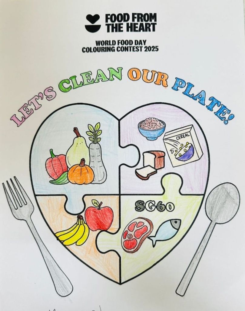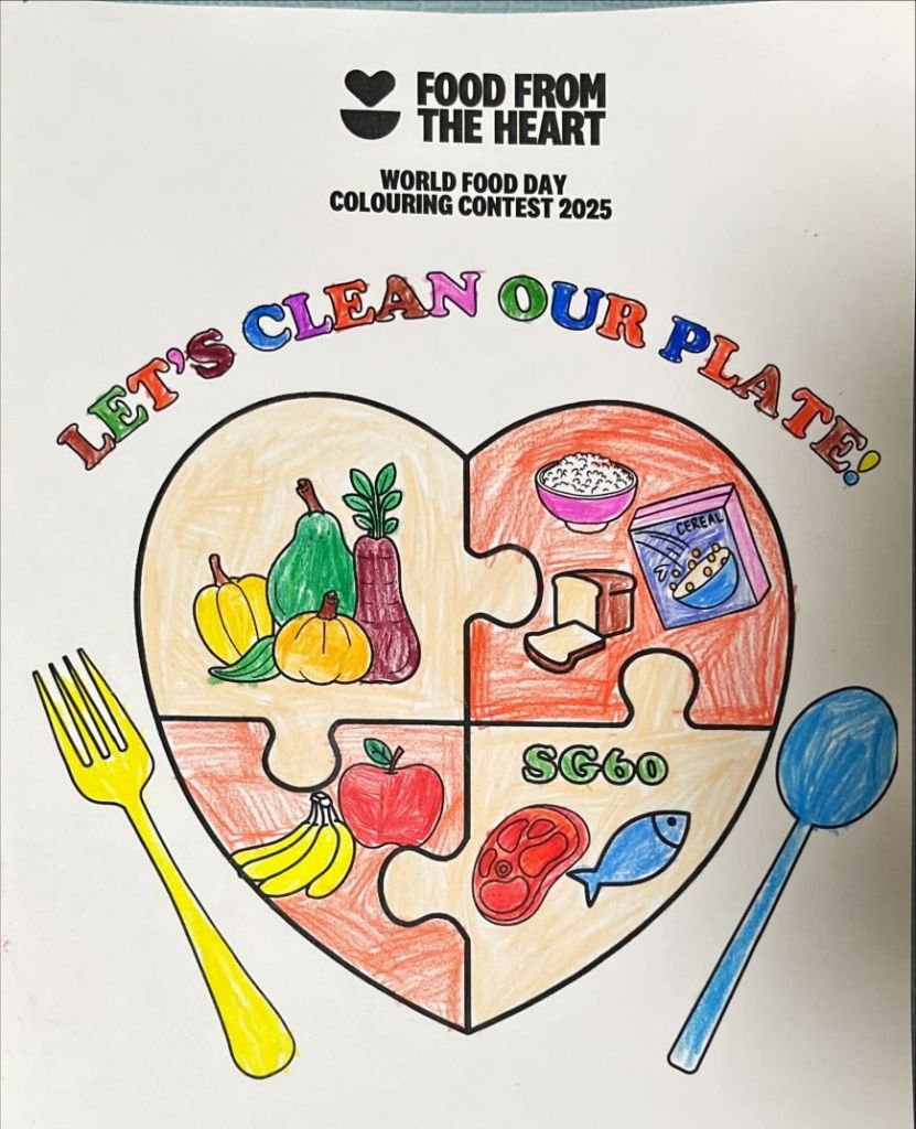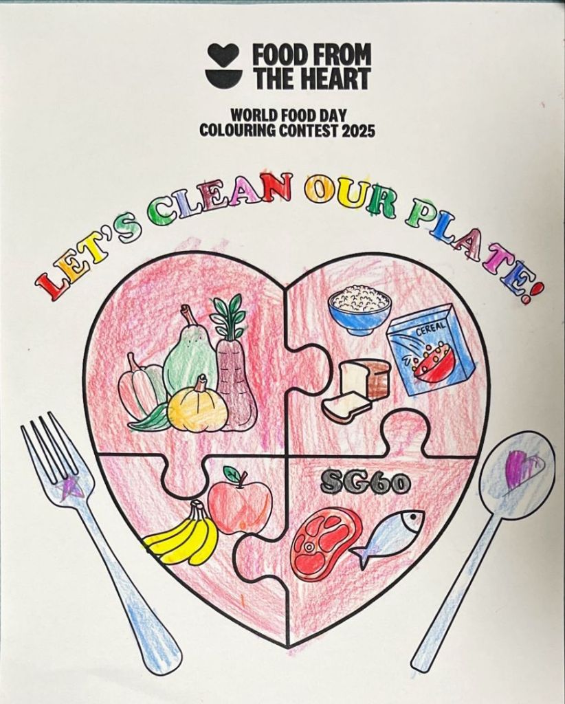 The Clean Plate Campaign is an initiative held in participating schools to educate students about reducing food waste and supporting communities in need. This year, in celebration of SG60 and World Food Day, we invited students to express their love for Singapore and its food heritage through art. From preschoolers’ joyful colouring sheets, to primary students’ “I Love My Singapore, I Love My Food” creations, and secondary students’ imaginative “Singapore on a Plate” interpretations, we were dazzled by the spectacular submissions!