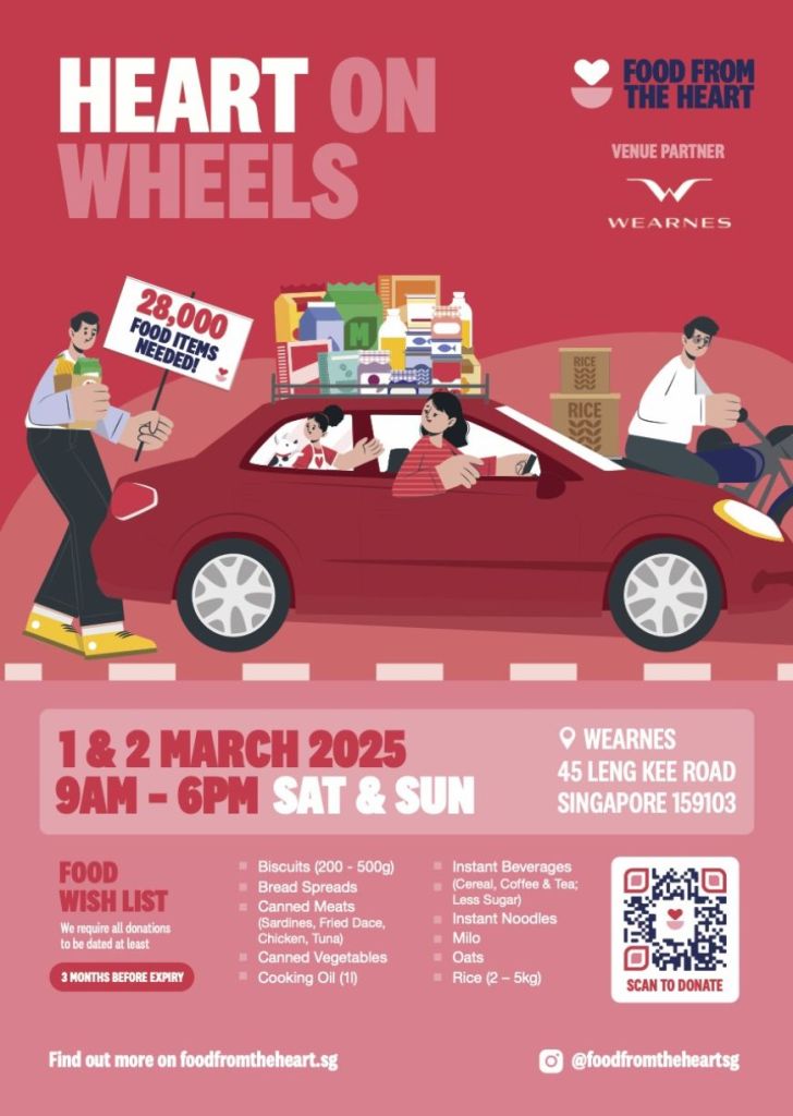 Come on down to WEARNES at 45 Leng Kee Rd Singapore 159103 on Saturday and Sunday, 1st and 2nd March 2025 with your food donations.