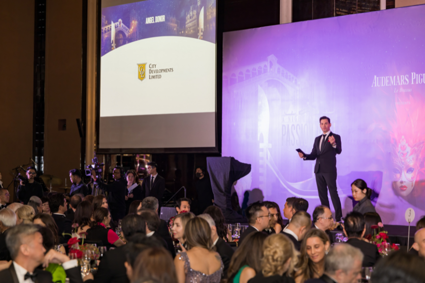 Emcee Bobby Tonelli introducing the event sponsors and donors, including Angel Sponsor City Development Limited, which is supporting their first Passion Ball